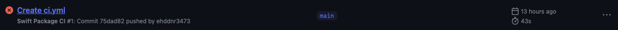 public struct MyNumbers { private let a = 10 private let b = 30 // 수정 public var isThirty: Bool { a + b == 30 ? true : false // false를 반환 } }수정하고 push(event 발생) 하면, 다시 workflow를 실행합니다. 그리고 아래 사진과 같이 빌드는 성공하지만, 테스트는 실패하게 됩니다.