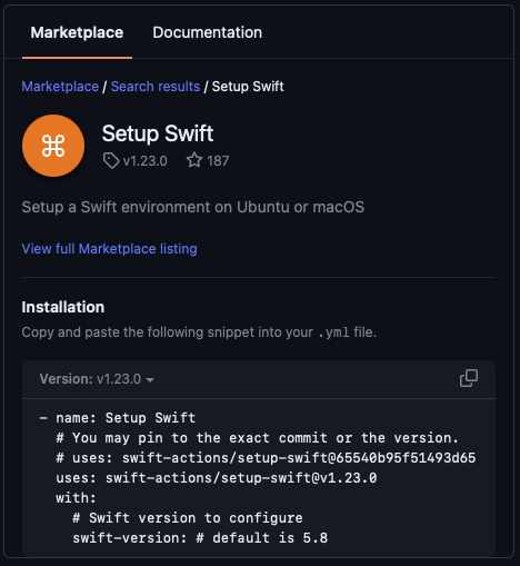 Run swift build -v error: 'actionspractice': package 'actionspractice' is using Swift tools version 5.8.0 but the installed version is 5.7.1 Error: Process completed with exit code 1.Swift package의 swift tools version과 Runner의 swift 버전이 일치하지 않아서 오류가 발생하고, 빌드 및 테스트를 수행하지 못한 것 같습니다. 문제를 해결하기 위해서 다음과 같이 Marketplace에서 탐색을 통해 해당하는 action을 찾고, 사용법대로 스크립트에 추가해줬습니다.