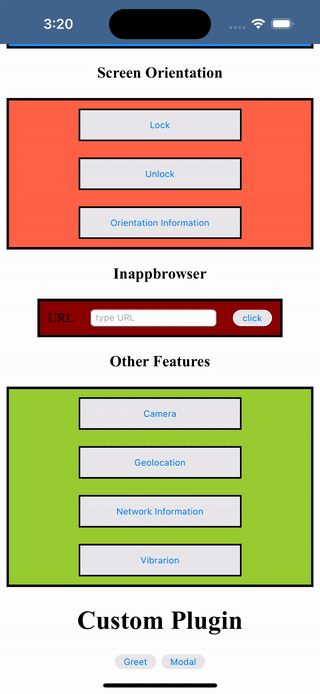 var exec = require('cordova/exec'); exports.greet = function(success, error) { exec(success, error, "CordovaSamplePluginSwift", "greet"); }; exports.presentModalView = function(success, error) { exec(success, error, "CordovaSamplePluginSwift", "presentModalView"); };브리지 역할을 하는 Javascript module을 위와 같이 작성하면, 아래와 같이 호출할 수 있습니다.