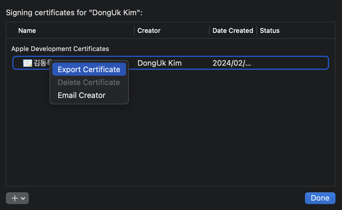 팀의 다른 사람에게 인증서를 공유하려면 Export하여 개인 키와 함께 넘겨주고, 받은 사람은 인증서를 더블 클릭하여 설치하면 됩니다.