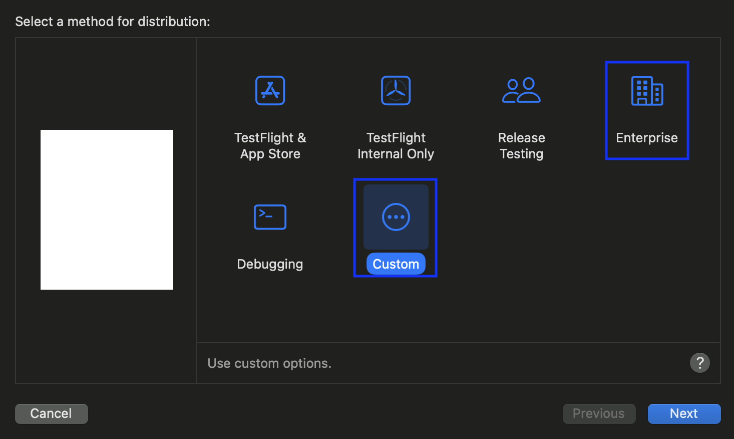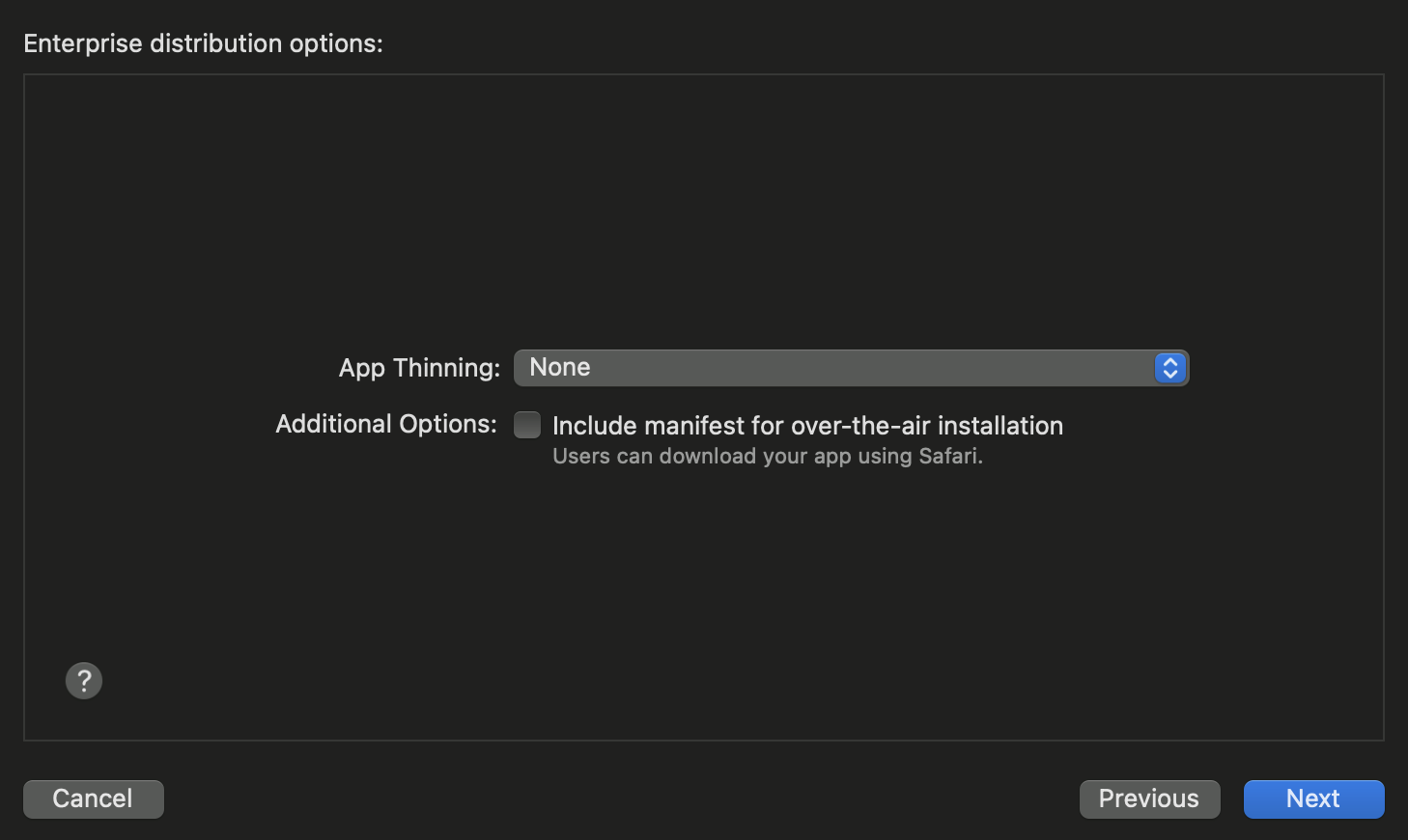 Additional Options: manifest.plist를 사용해서 웹을 통해 애플리케이션을 배포하려면 체크합니다.