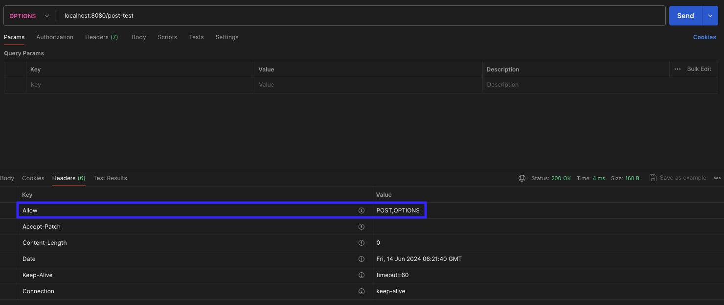 서버가 특정 리소스에 대해 지원하는 HTTP 메서드의 목록을 반환하도록 요청한다. 클라이언트가 서버와의 통신에 사용할 수 있는 메서드를 사전에 확인하기 위해 사용된다. 서버는 Allow 헤더에 가능한 메서드 목록을 넘겨준다. 아래는 Postman을 사용해서 테스트한 이미지이다.