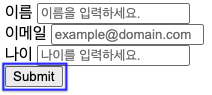 <body> <form th:action="@{/members/join}" method="post" th:object="${memberForm}"> <label th:for="name"> 이름 <input type="text" th:field="*{name}" placeholder="이름을 입력하세요."/> </label> <p th:if="${#fields.hasErrors('name')}" th:errors="*{name}">Name Error</p> <br> <label th:for="email"> 이메일 <input id="email" th:field="*{email}" type="email" placeholder="example@domain.com"/> </label> <p th:if="${#fields.hasErrors('email')}" th:errors="*{email}">Email Error</p> <br> <label th:for="age"> 나이 <input type="text" th:field="*{age}" placeholder="나이를 입력하세요."/> </label> <p th:if="${#fields.hasErrors('age')}" th:errors="*{age}">Age Error</p> <br> <button type="submit">Submit</button> </form> </body>클라이언트에서 수행하는 검증은 생략했습니다.