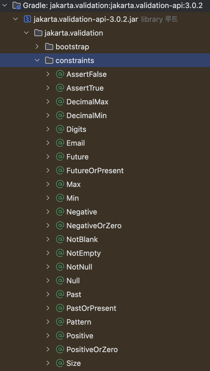 import jakarta.validation.constraints.Min; import jakarta.validation.constraints.NotEmpty; import jakarta.validation.constraints.NotNull; import lombok.Getter; import lombok.Setter; @Getter @Setter public class MemberForm { @NotEmpty(message = "이름을 입력해주세요.") private String name; @NotNull(message = "나이를 입력해주세요.") @Min(value = 18, message = "18세 이상") private Integer age; @Pattern(regexp = ".+@.+\\..+", message = "이메일 형식이 올바르지 않습니다.") private String email; }@NotEmpty, @NotNull 등 어노테이션으로 각 필드에 제약조건을 추가하고 메시지를 설정해줄 수 있습니다. 메시지는 검증 실패시 BindingResult 객체에 저장됩니다. 제약조건 종류는 아래와 같습니다.