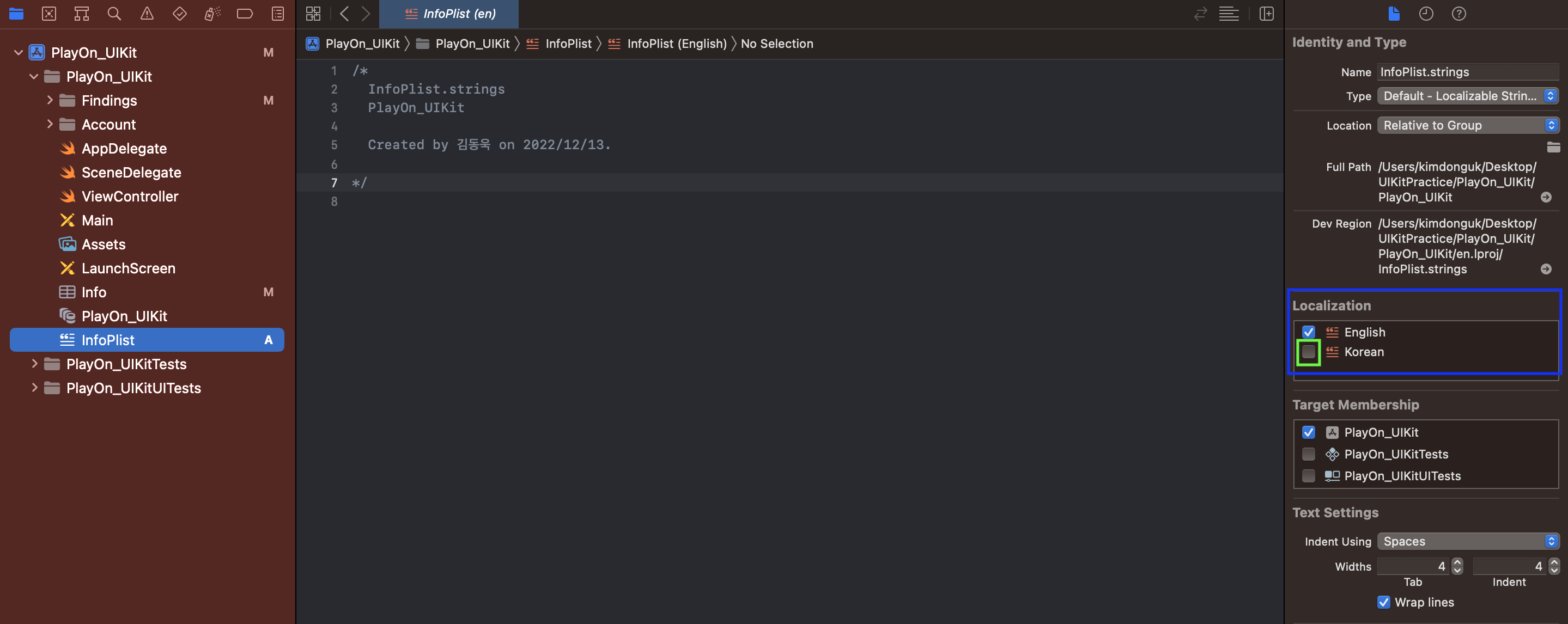 첫 번째로, 순서는 중요하지 않습니다. Project > Info > Localization에서 먼저 언어를 추가하였을 때 InfoPlist.strings를 추가하고, 다음과 같이 inspector에서 추가해주시면 됩니다. 삭제할 때는 반대로 체크를 해제하시면 됩니다.