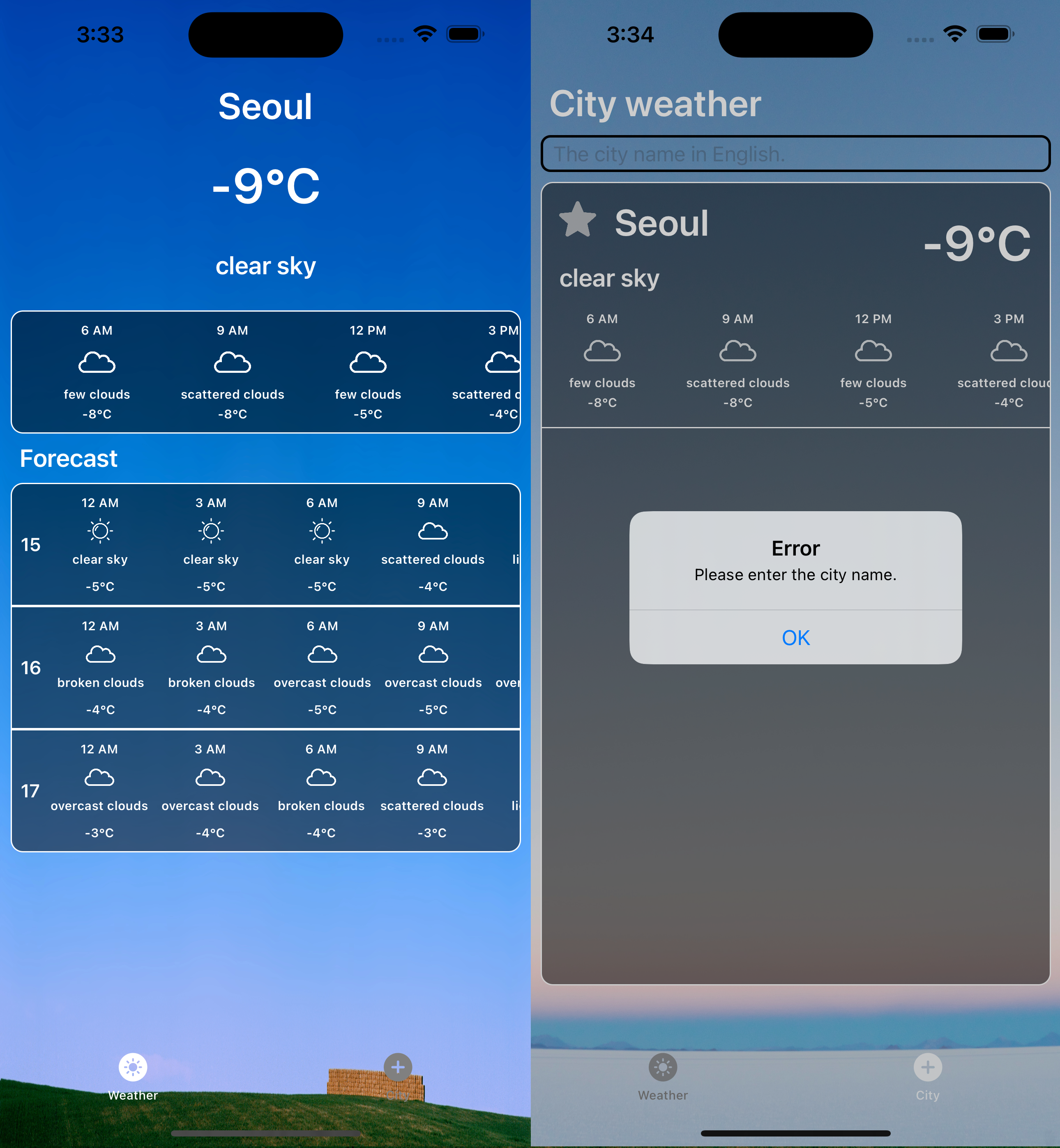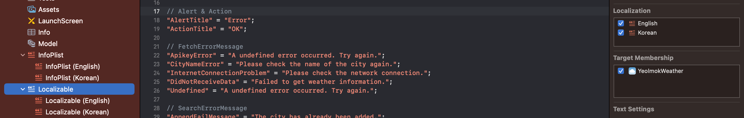 "Weather" = "날씨"; "City" = "도시"; "Forecast" = "예보"; ...이제 NSLocalizedString(_:tableName:bundle:value:comment:) 함수를 사용하여 각 문자열을 현지화해주면 됩니다.