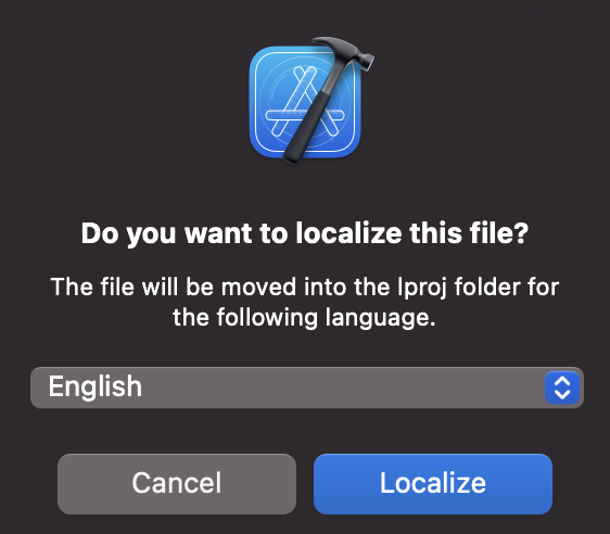 func NSLocalizedString( _ key: String, tableName: String? = nil, bundle: Bundle = Bundle.main, value: String = "", comment: String ) -> StringtableName은 strings 파일의 이름을 입력해주면 됩니다. tableName이 nil이거나 빈 문자열일 경우, 기본값은 Localizable입니다. 따라서 strings 파일을 나누어서 사용하지 않고, Localizable.strings만을 사용할 경우 적어주지 않아도 됩니다. 물론, 다른 이름으로 strings 파일을 생성하고 tableName으로 그 이름을 넘겨준다면 상관없습니다. value는 테이블에서 키를 찾을 수 없으면 반환하는 문자열입니다. comment는 strings 파일에서 키-값 쌍 위에 배치할 설명입니다. 단어는 사용되는 문맥에 따라 여러 가지 다른 의미를 가질 수 있습니다. 현지화를 수행하는 만큼, 혼란을 야기할 수 있는 단어에 comment를 추가하여 문자열에 대한 문맥을 제공할 수 있습니다.