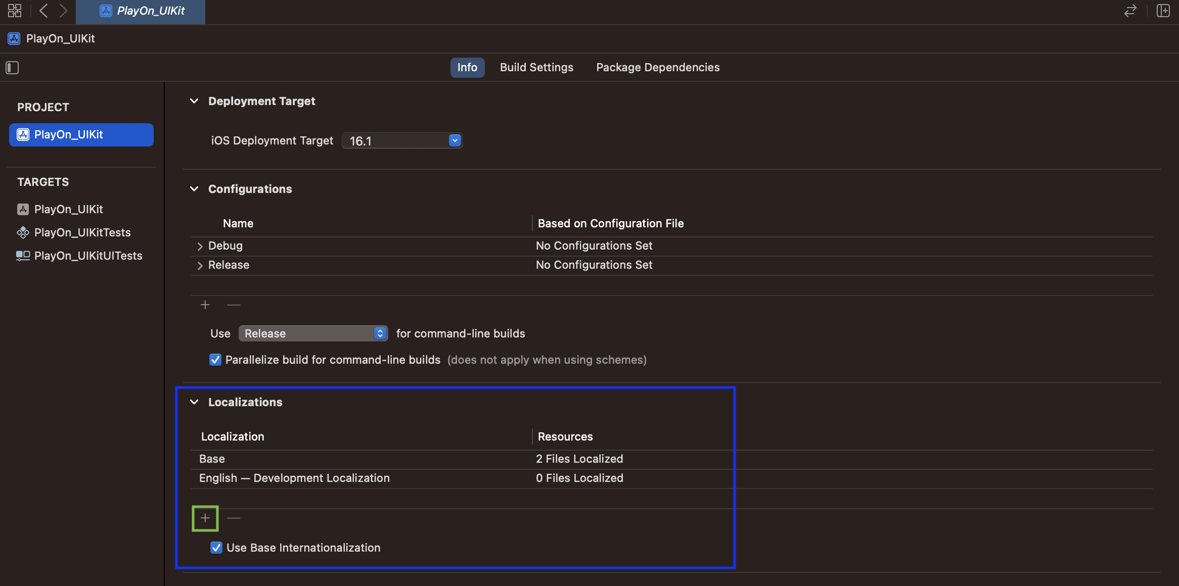 이제 Project > Info > Localizations 로 가서, 언어를 추가해줍니다.