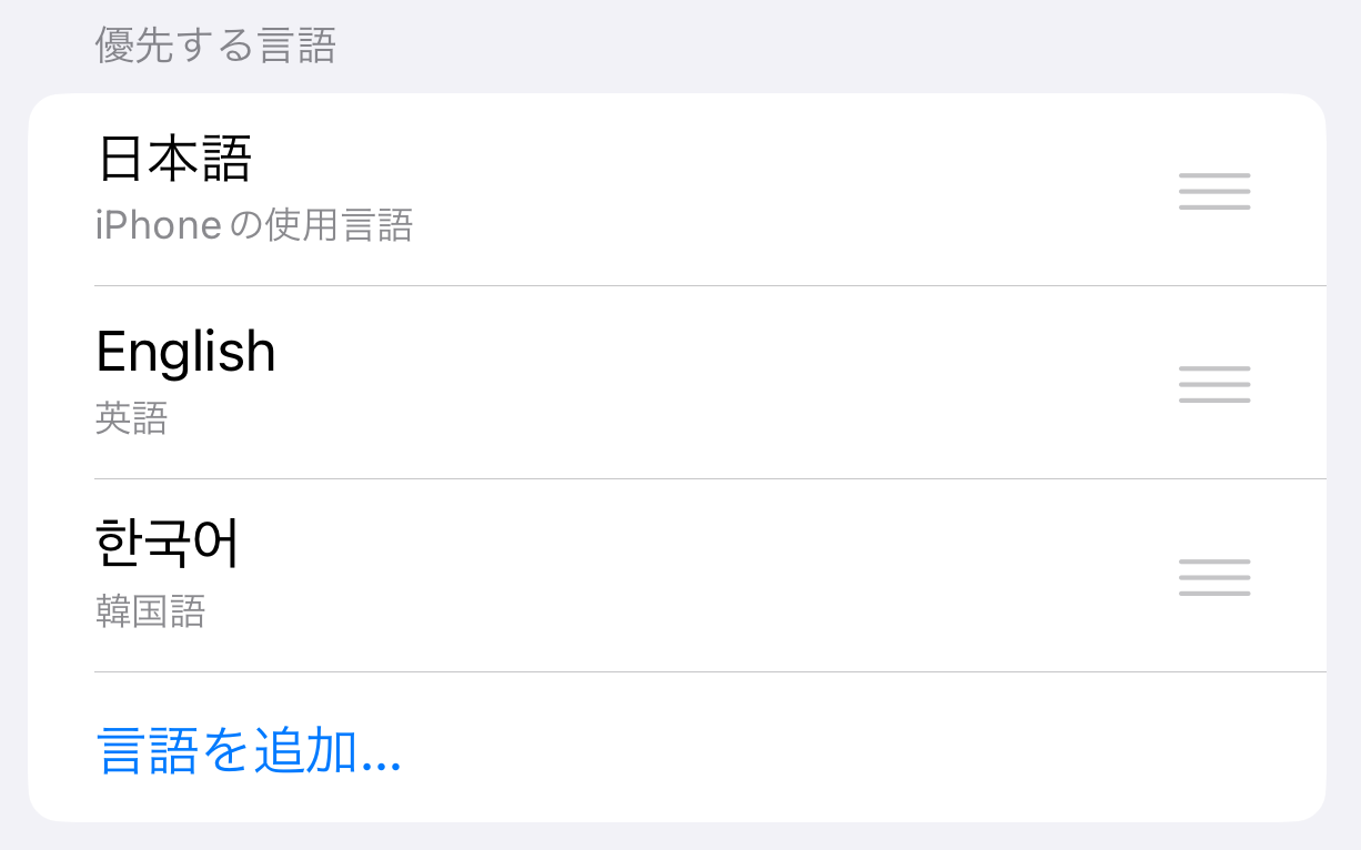 그리고 XCode의 Project > Info > Localization에 등록되어 있지 않은 언어 선택 시 선호하는 언어의 순서, 즉 우선순위에 따라 Locale 프로퍼티의 값이 정해집니다. XCode에서 영어와 한국어를 localizations에 추가했을 때, 시뮬레이터나 기기에 아래 사진과 같이 '선호하는 언어'가 설정되어 있다면, 일본어는 추가되어있지 않으니 밀려나고 다음 순위인 영어가 선택되어, 다음과 같이 출력됩니다.