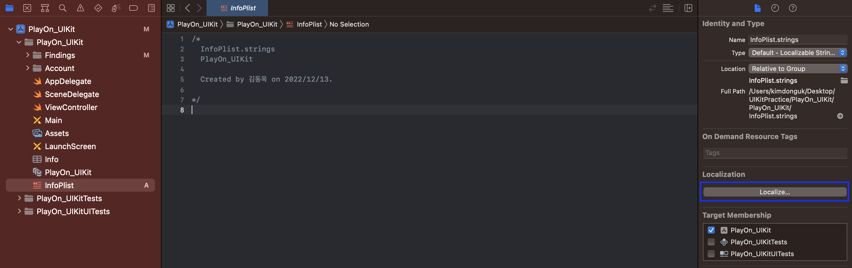 앱 이름과 마찬가지로 Strings 파일을 사용할 수 있습니다. 이름은 Localizable.strings로 생성합니다. 파일 생성과 기본적인 설정은 앱 이름 설정할 때와 똑같습니다.